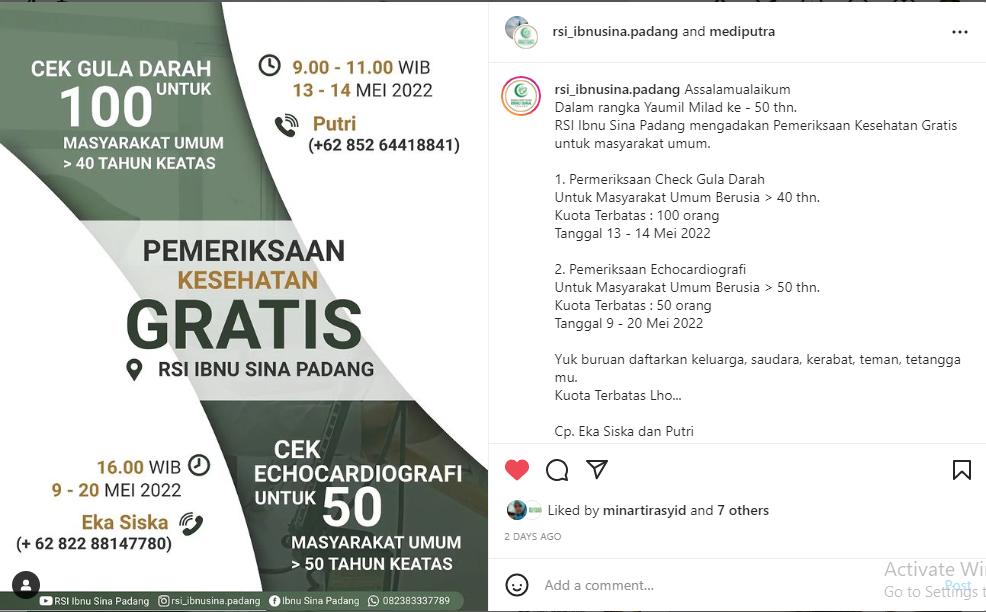 RSI Ibnu Sina Padang mengadakan Pemeriksaan Kesehatan Gratis untuk masyarakat umum.